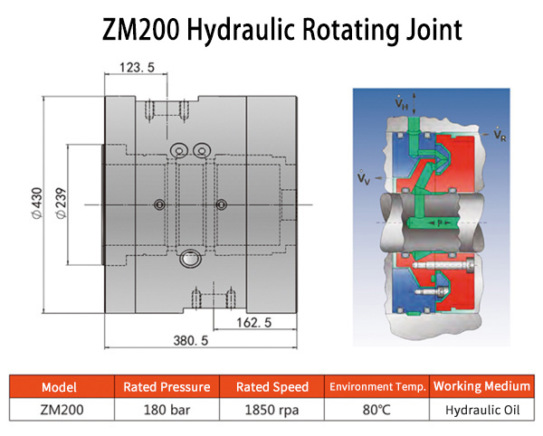 ZM200J hydraulic rotary joint use the small clearance between fixed parts and rotating parts, under the condition of high speed and high pressure to local change the flow area, cause a pressure loss of liquid flow, thus results in a very low leakage and returns to oil tank through the oil drainage port. This kind of sealing structure has high requirements for the geometrical size, surface machining precision and assembly of the parts.