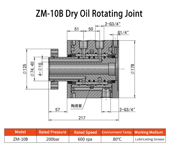 ZM-10B is a high flow dry oil rotating joint with two separate channels. The joint housing is provided with a ceramic cover with self-centering function, the central shaft is fitted with a very durable seal, make it achieve good sealing effect. Cause the ceramic cover with high degree of finish and hardness, the sliding between the ceramic cover and the sealing parts is smoothly, greatly prolongs the service life of the joint. But during the operation process, because the seal and the ceramic cover friction contact, there is a heating problem, need to install a circulating colling water to eliminate it.
